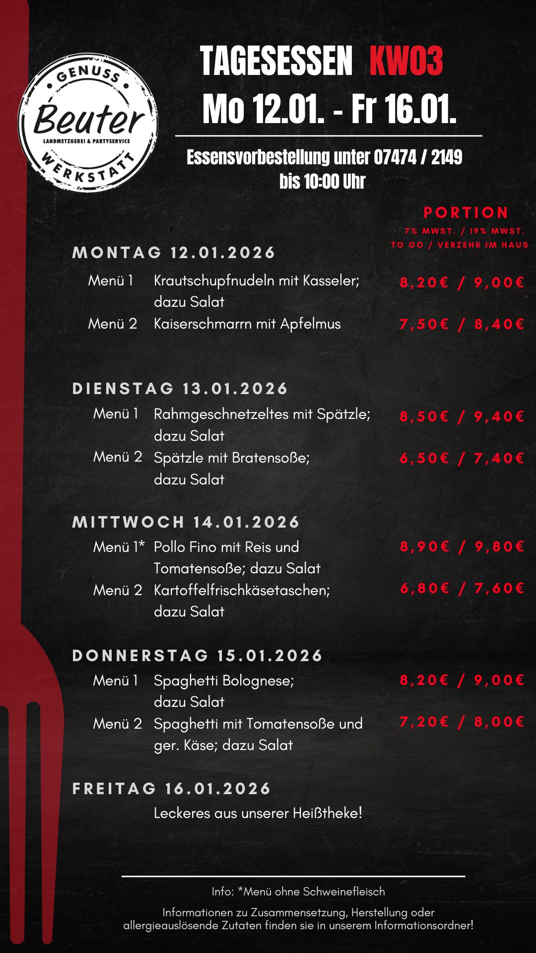 Unser täglich wechselndes Mittagsmenü erhalten Sie ab 11.30 Uhr im Hauptgeschäft (auf Vorbestellung) sowie in unserer Filiale in Hirrlingen.